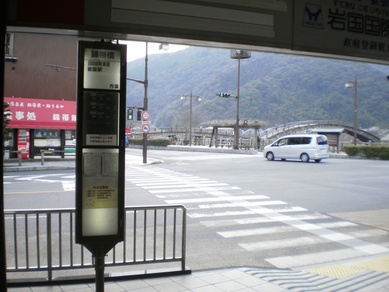 JR岩国駅から錦帯橋はかなり離れているので、路線バスを利用しました。バス乗り場は駅前にあって運賃は250円でした。 車窓の景色はごく普通で錦帯橋近くの橋の駅の向かい側で、道を渡ると錦帯橋はすぐに見えます。 帰りは橋の駅の1階が待合所になっています。