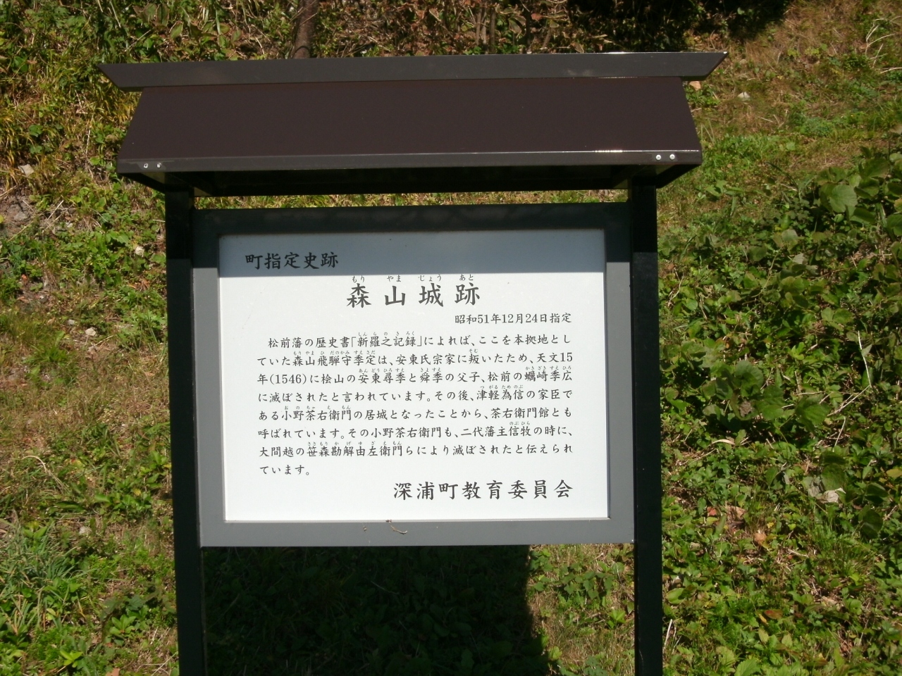 深浦町の森山海岸の小さな岬に「森山城跡 (茶右衛門館) 」があります。JR十二湖駅から車で2~3分国道101号線を北に走り、国道からそれて五能線を超えてしばらく走ると岬の根元に「町指定史跡森山城跡」の説明版があります。説明版には、『松前藩の歴史書「新羅之記録」によれば、ここを本拠地としていた森山飛騨守季定は、安東氏宗家に叛いたため、天文15年(1546)に桧山の安東尋季と舜季の父子、松前の蠣崎季広に滅ぼされたと言われています。その後、津軽為信の家臣である小野茶右衛門の居城となったことから、茶右衛門館とも呼ばれています。その小野茶右衛門も、二代藩主信牧の時に、大間越の笹森勘解由左衛門らにより滅ぼされたと伝えられています。』と記載されています。