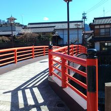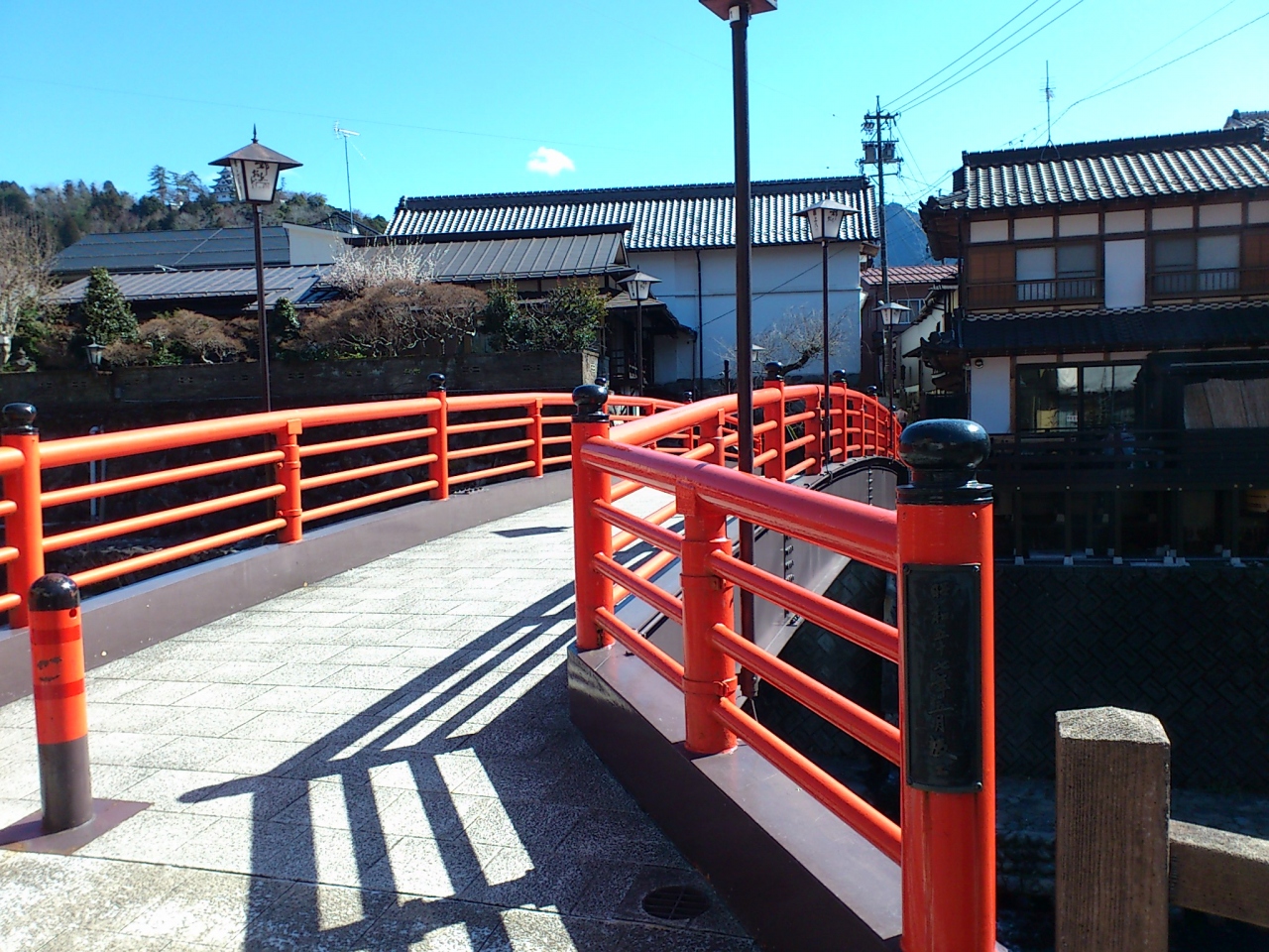 郡上八幡の有名な名水の観光地の宗祇水近くに掛かる赤い橋です。宗祇水に行くのに道に迷って、この橋を渡って行きました。少し太鼓橋風に反りが付いている石畳舗装の歩行者専用道路の橋です。赤い欄干で、とても目立ちます。