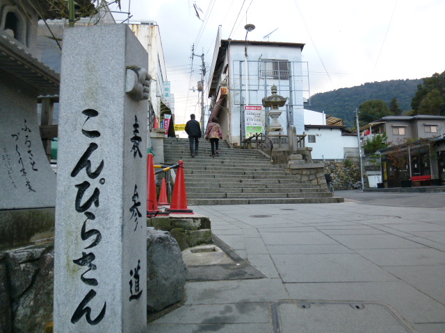 今日は香川県琴平にある「金刀比羅宮」にきています。もう頂上の本宮まで登ります、階段多いんでしょう。ここ金比羅さんは階段を登って行きますので当然ながら参道も階段の中にあります。お菓子屋や小物置物の土産屋さんや食堂が並んでいます。この参道も一之坂鳥居付近まであります。登りは良いのですが、帰りの下りは店に集中していると足元の階段を踏む外すので注意してくださいね。杖を借りるのも良いかもしれません。