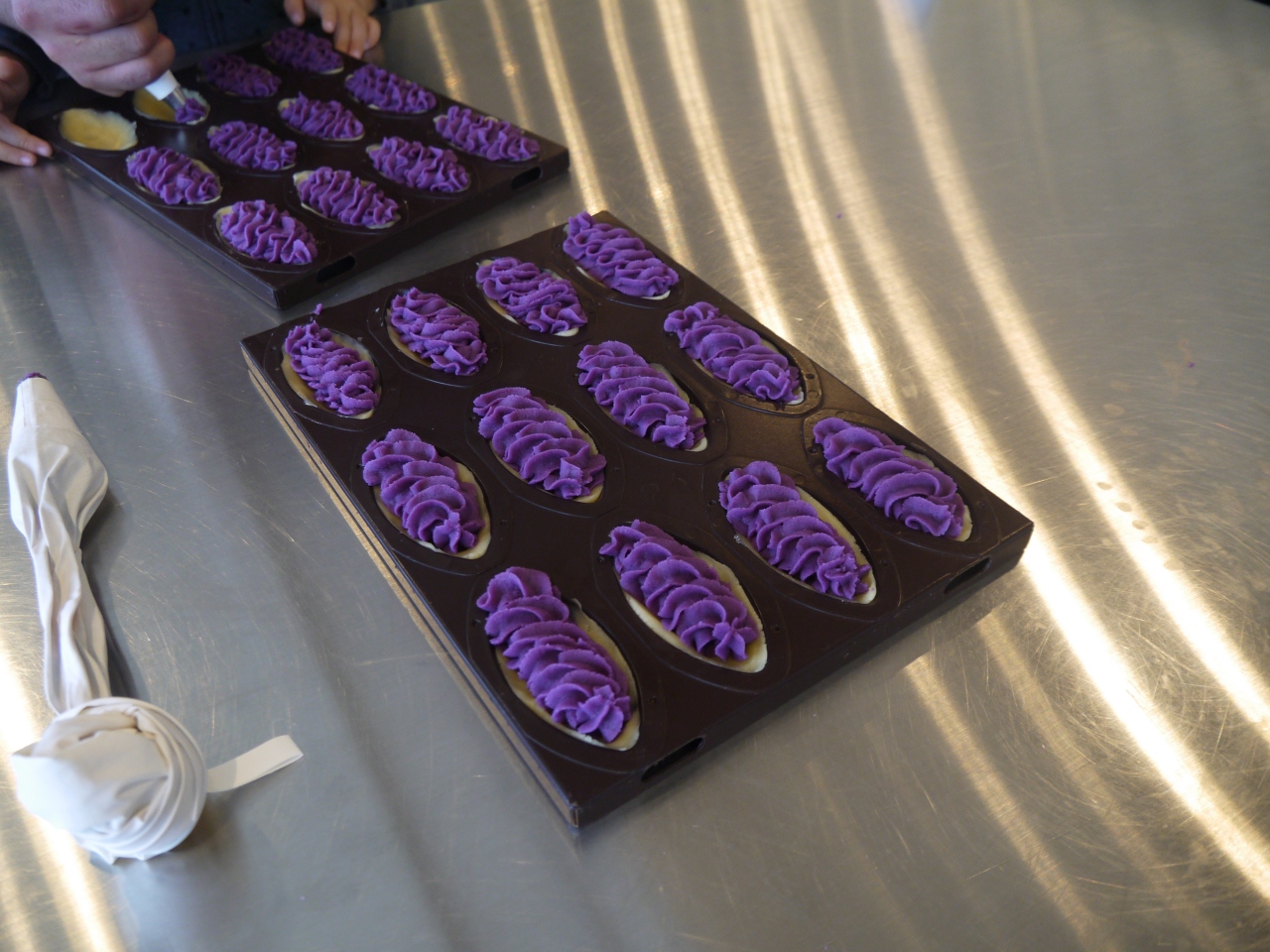 タルト生地を型に合わせて、紅芋生地を絞りだし、オーブンで焼いてくれます。