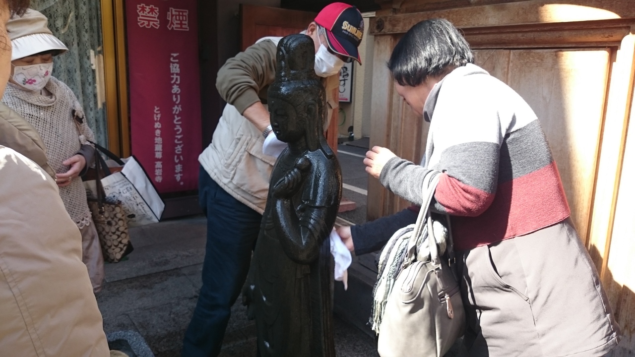 境内に入って左の奥に洗い観音があります。多くの人が並んで順番を待っていました。水をかけ、タオルで身体の悪いところを洗います。昔と違い、たわしは使わないそうなので、観音様の肌は形を保った状態で全身すべすべでした。