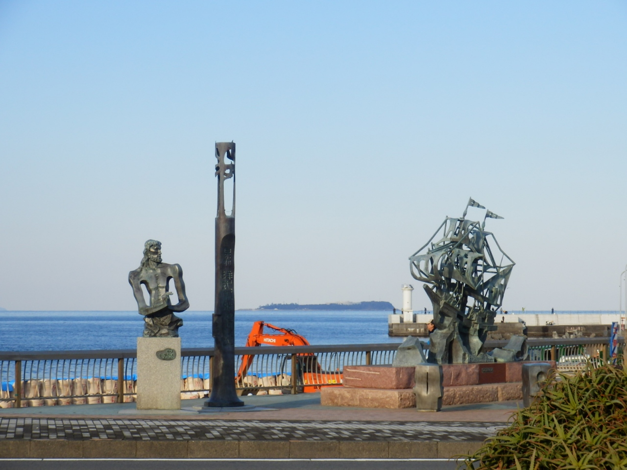 海沿いにあるなぎさ公園から南へ、大きな橋を渡ってすぐの場所に、ウィリアム・アダムズ(三浦按針)の胸像と帆船のモニュメントがありました。この場所は日本初の洋式帆船を建造した歴史ある場所ということだそうです。残念ながら、訪れたときは、周辺は工事中でしたが、近いうちに綺麗な公園になるかと思います。