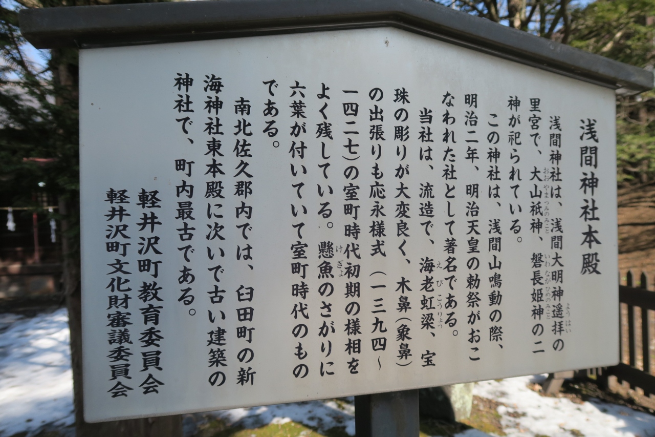 追分郷土館の横にある室町時代(本殿)にできた木造建築の社で、浅間山の鳴動(火山性地震)が続き、その鎮静祈願で明治天皇の勅祭のあった社でもある。 外観は歴史ある社とは裏腹に屋根の一部がトタン張りになっていて、かつ観光用に整備されていないので、非常に残念な扱いになっているような気がする。 駐車場は追分郷土館のものを利用できる。