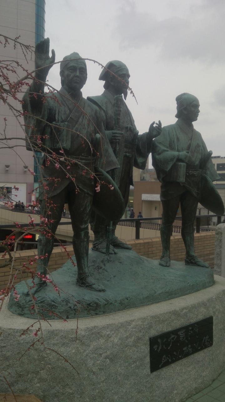 JR水戸駅から弘道館に向かう途中にあった助さん格さんを連れた黄門さまの銅像がたっています。