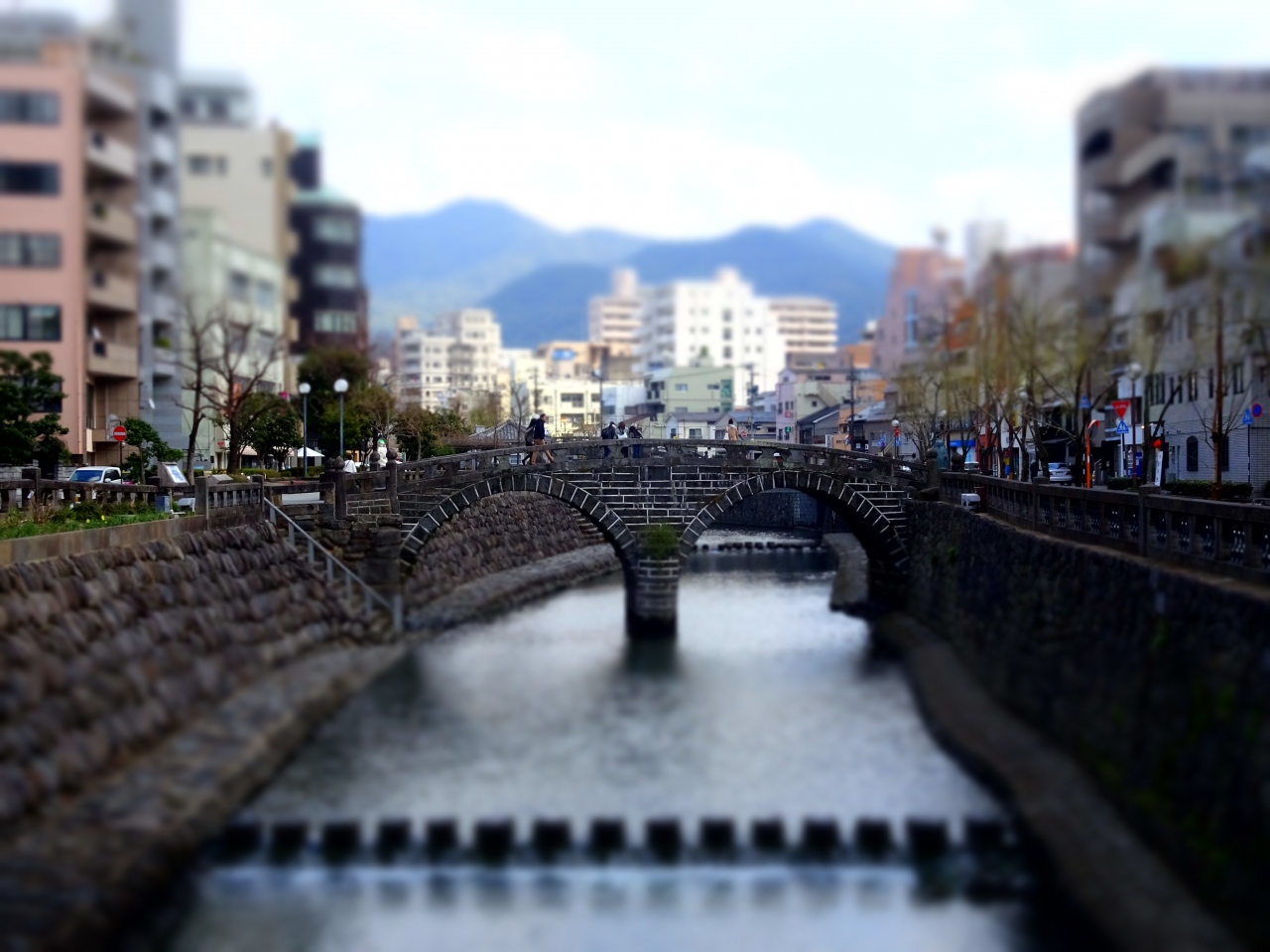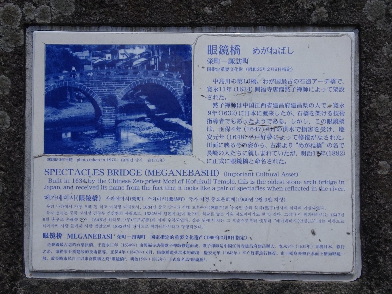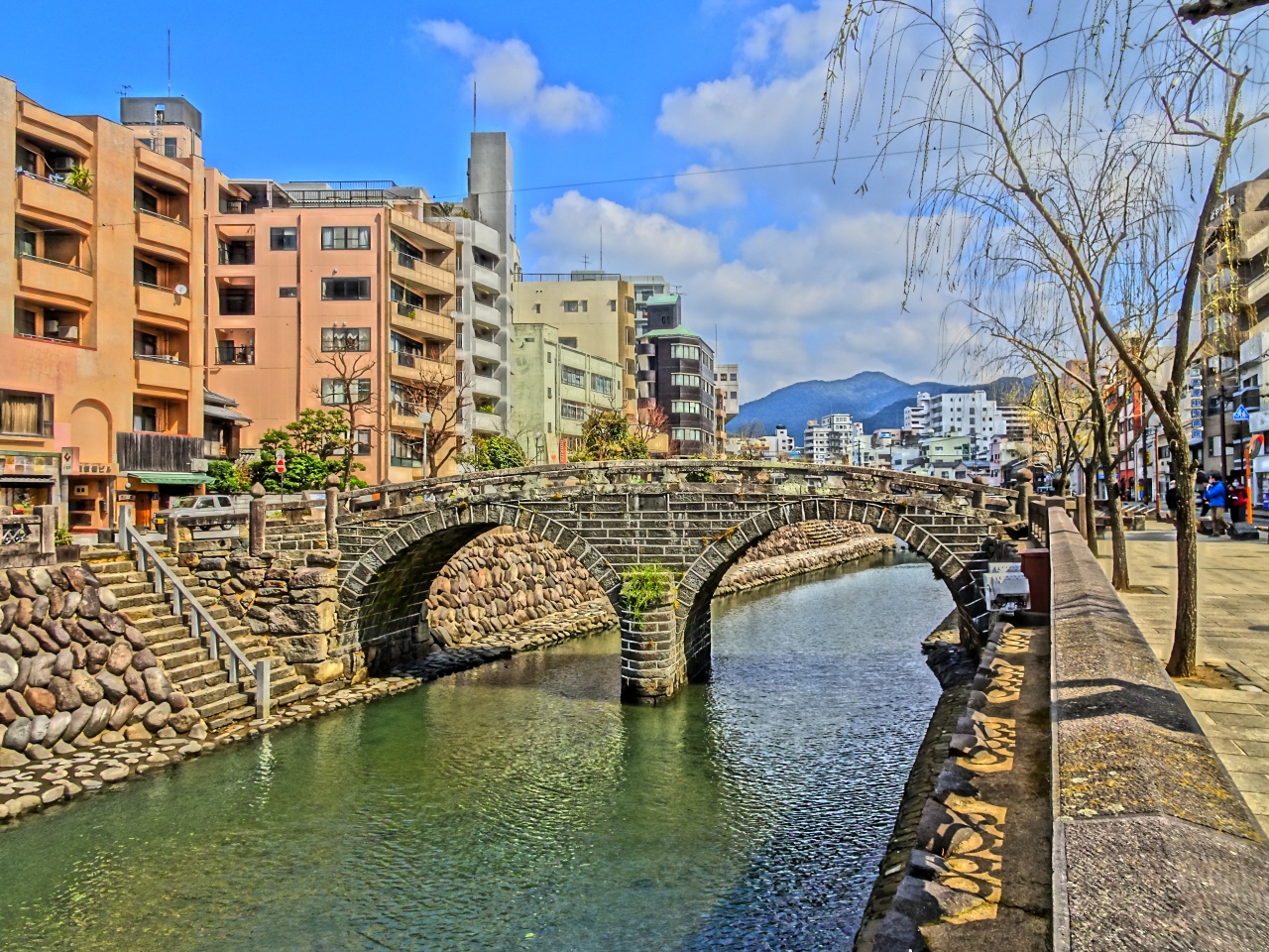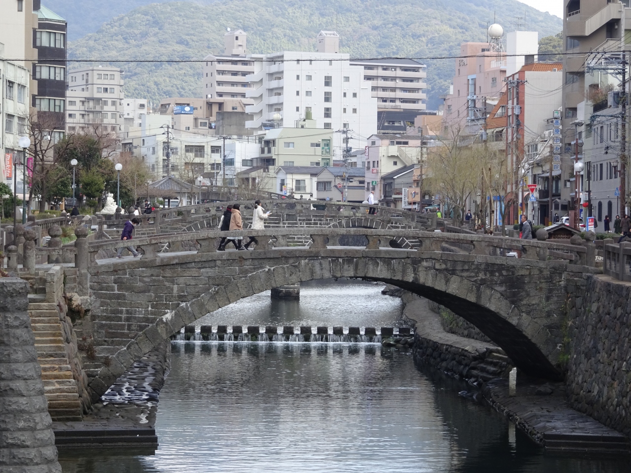 日本初の石造りアーチ橋で国の重要文化財に指定されています。眼鏡橋付近の堤防にハートの形をした石が20個前後はめられており、観光に一役買っている…そうですが、わたくしはそれを知らずに行っていまったので、見つけておりません。