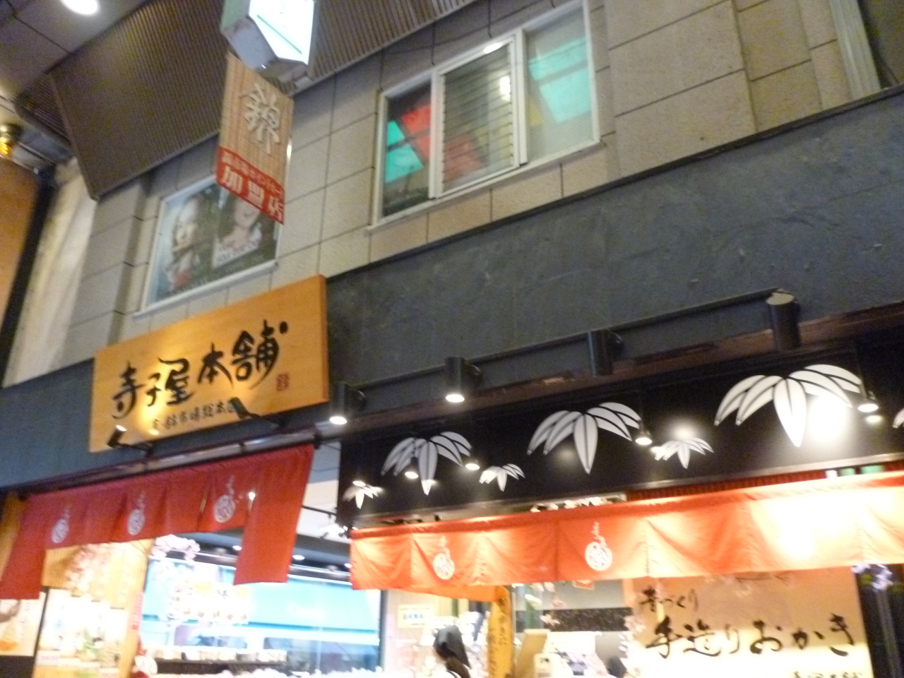 錦市場での食べ歩き開始は、西の入り口にあるおかき屋さんです。観光地でよく見かけるチェーン店です。串ぬれおかきミックスを食べました。色んな種類の味が楽しめて、ちょっとお得な気分になりました。他にも食べ歩き用の1枚売りがありました。