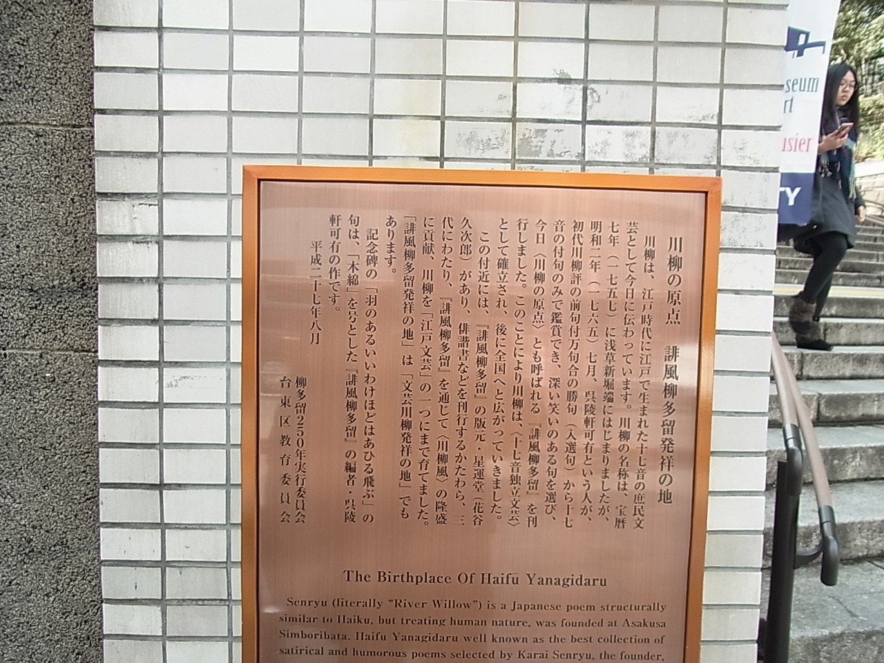 京成上野駅から上野公園に入る階段脇にある「川柳の原点 誹風柳多留発祥の地」という記念碑。結構、新しい感じだったのですが昨年の夏に除幕式が行われたそうです。正直、ほとんど人が素通りで10人に一人くらいが、振り返るといった感じでしょうか。