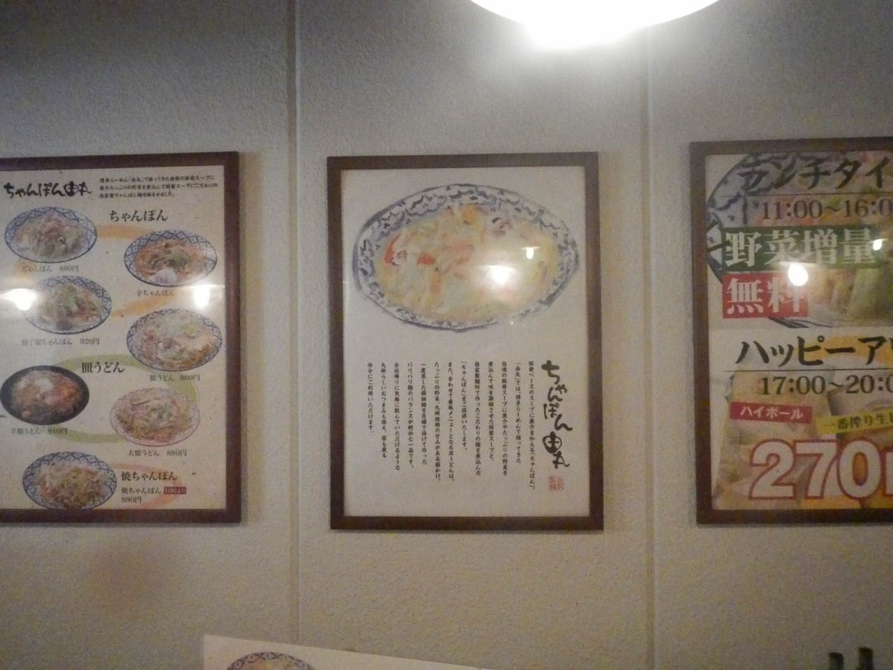 「博多ラーメンで培ってきたスープ」という売り文句がイマイチだ。ちゃんぽん1杯880円だった。値段の割にはどうなんだろうか。具のアサリの火の通し方がよく、美味しいといえば美味しいが、コスパはあまりよくない。