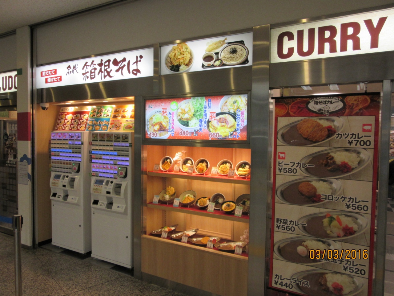 小田原駅構内にある箱根そばの支店。入口は駅の外側一か所。食券を購入して注文する。