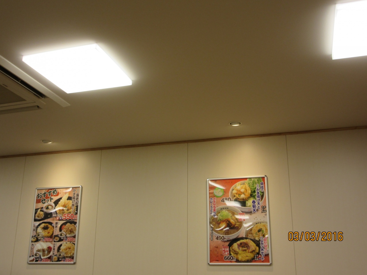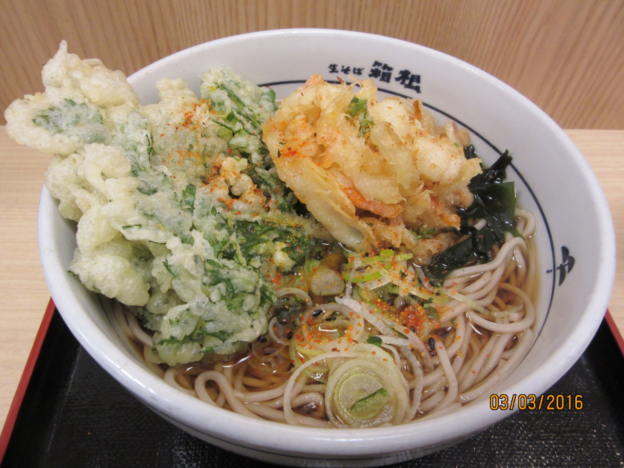 貝柱のミニかき揚げ天と春菊天そば480円を注文。手軽に短時間で食事が出来て麺・天ぷらもほどよく美味しいので乗り継ぎの時間調整などに使い勝手の良い店だ。