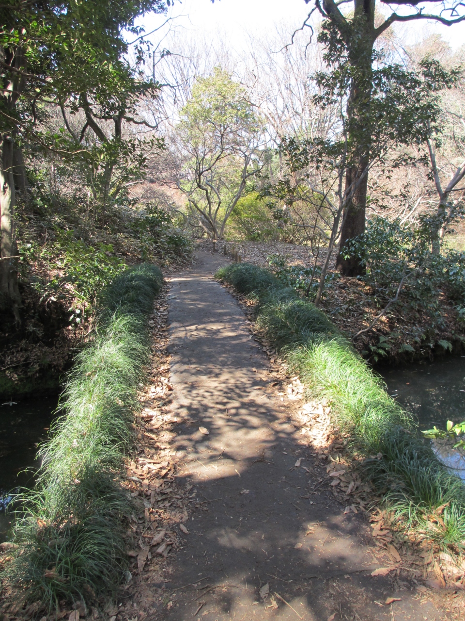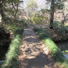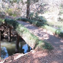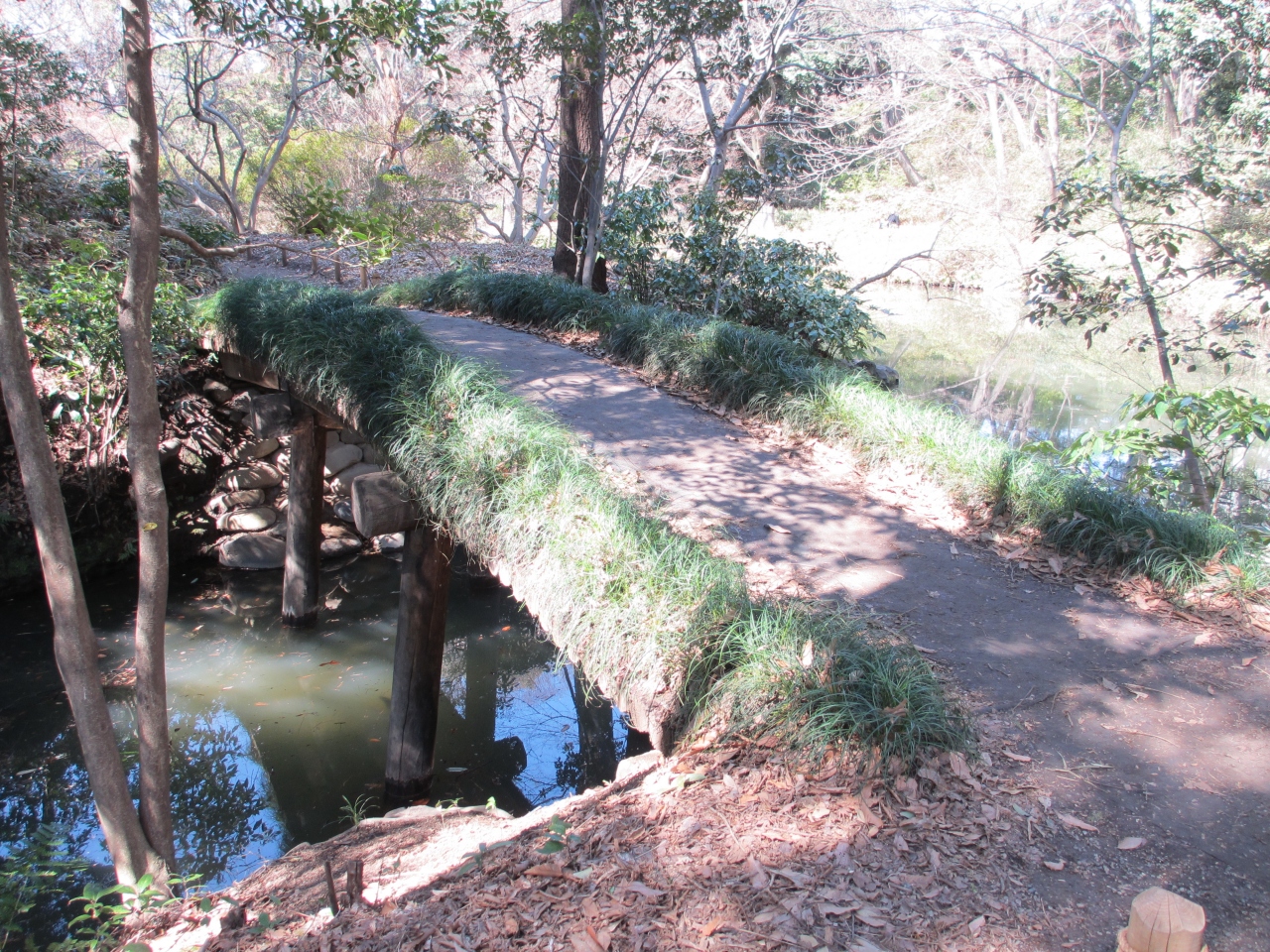 六義園内にある土橋四つのうちの一つです。芦辺茶屋跡からささがにの道へ行く途中にある橋で木製ですが土が積まれ草がきれいに生えていて風情があります。藤代峠から渡月橋を渡る人は多いですが、林の中の藤波橋を渡る人は少ないです。