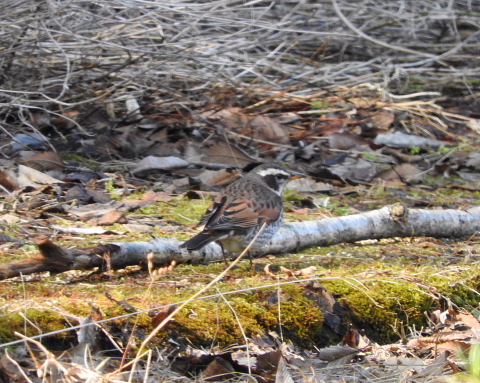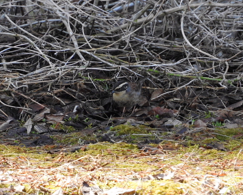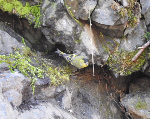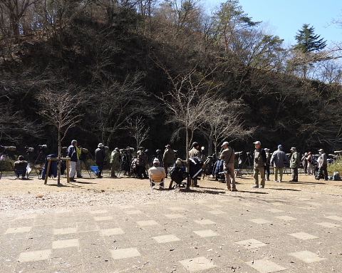 小河内ダムを渡って対岸の奥多摩湖いこいの路を目指して歩きます。ダムを渡り終えると小さな公園のような広場があり、すでに80名程のカメラマンが待機していました。あのバズーカ砲のような超望遠レンズのカメラがずらりと並んでいます。後から来た人は割込むスペースも無い程です。隣りの人にヤマヒバリが出ているか聞いた所、8時頃に一度出たとの事、期待が持てます。本命のヤマヒバリが出る迄、前座に出てくるマヒワやエナガ、ツグミ、カヤクグリなどを撮影して時間潰しをします。9時半頃、待望のヤマヒバリが出ました。私は、ヤマヒバリはバードウォッチング歴20年余にして初めてお目にかかる珍鳥です。初めは警戒して藪の陰で採餌していましたが、徐々に藪から出てきました。周囲のカメラから一斉に軽機関銃のような連射のシャッター音が鳴りひびきます。ヤマヒバリはすぐに藪に隠れてしまいましたが、しばらくして、また藪から出てきました。午前中に3回、隠れたり出たりを繰り返してから山の方に飛んで行きました。何とか証拠写真も撮れたので、満足して奥多摩湖を後にしました。