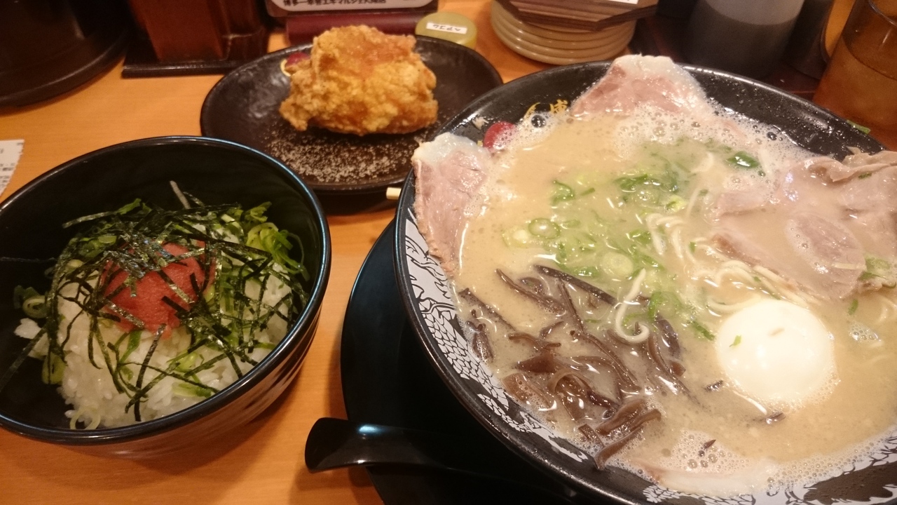 お腹が減っていたので心意気セット(煮卵チャーシュー乗せのラーメン、明太子ご飯、唐揚げまたは替え玉)を注文。