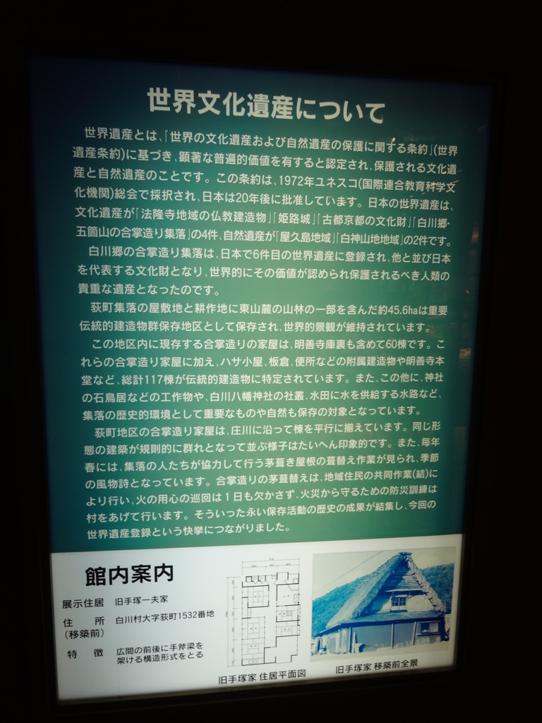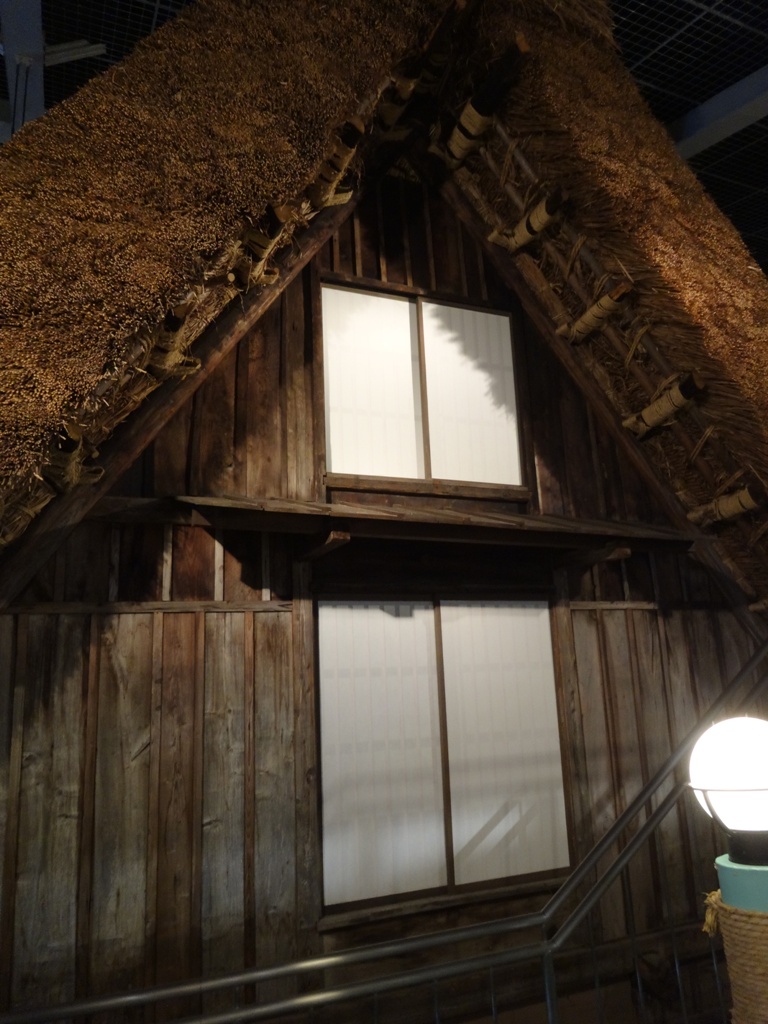 館内に入ってすぐお土産売り場があります。お土産売り場の奥へ行くと、合掌造り住宅が展示されています。観光に行った日の天気が良くなかったので、ここでじっくり鑑賞することができました。元々は手塚家として実際に使用されていた住宅を移築したもののようです。