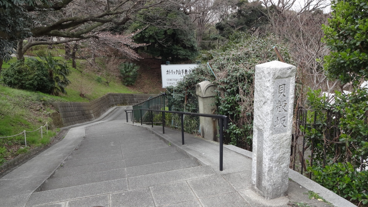 元町公園と外国人墓地の間を通り山手本通りへ至る坂道です。坂の名は、外国人墓地の崖土の中に貝殻片が混ざっていたからとか、周辺に貝塚があったから、などといわれています。6月には紫陽花が彩り、外国人墓地の景色など表情豊かな坂道です。