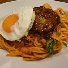 ソースがからみついた太麺のナポリタンに、肉汁たっぷりのハンバーグ、目玉焼きも載せて、豪快に食べましょう!
