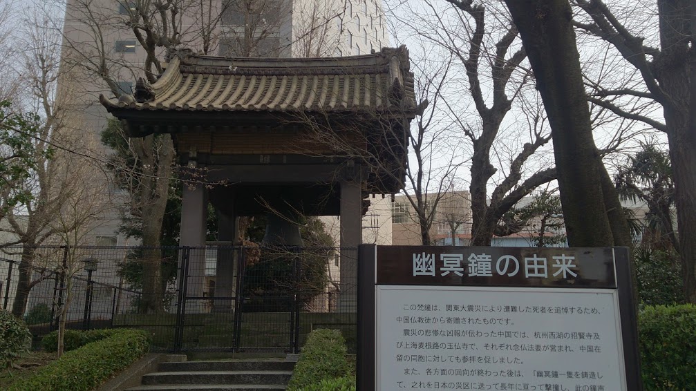 関東大震災や東京大空襲における被災者の慰霊、説明展示、関連品の展示など、これらを管理・慰霊・展示する施設がある、横網町公園ですがその一画にこちらの鐘楼もあります。清澄通り側の門から入ってすぐ左手にあるのですぐにわかります。瓦屋根で灰色の柱、梁の楼で落ち着いた雰囲気です。鐘自体は中国から贈られたもで、円柱型ですが裾側が外側に広がっていく形状のもので、日本の寺社仏閣ではほとんど見ることがないスタイルです。鐘楼のすぐ脇に説明ボードがあって、関東大震災の死亡者を追悼するために中国の仏教徒から贈られたものであること、この地に鐘が設置されるまでの経緯が分かり説明されています。