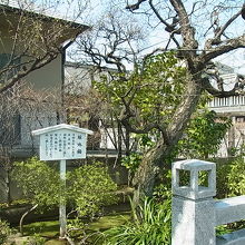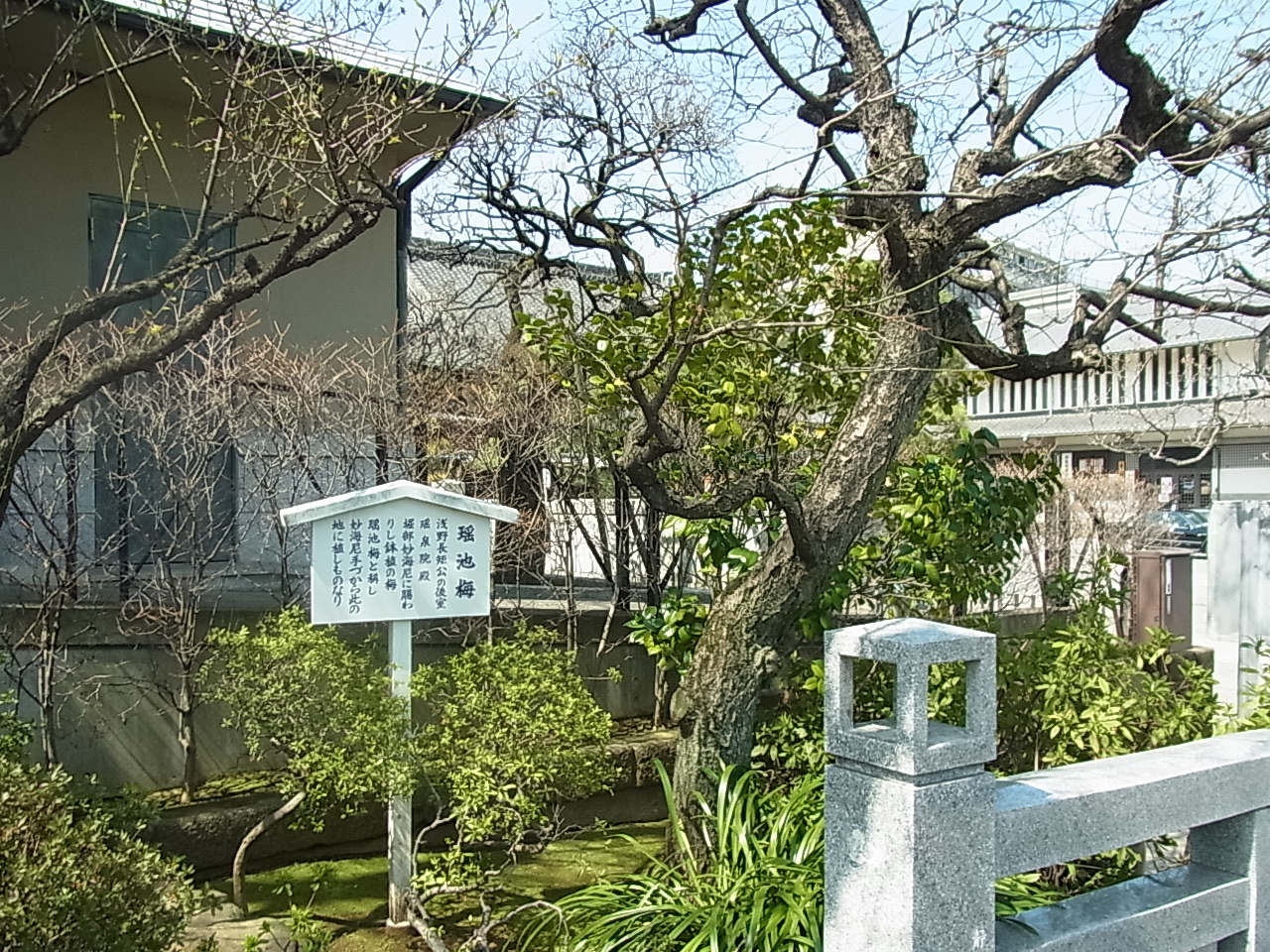 泉岳寺山門を潜って本堂を正面に見て左手、講堂を囲むようにして主税梅、血染めの梅、血染めの石などが並びます。もともとは、義士の墓守をした堀部妙海法尼が瑤泉院から賜った鉢植えの梅をここに移植したものだそうです。