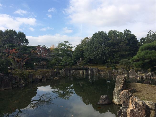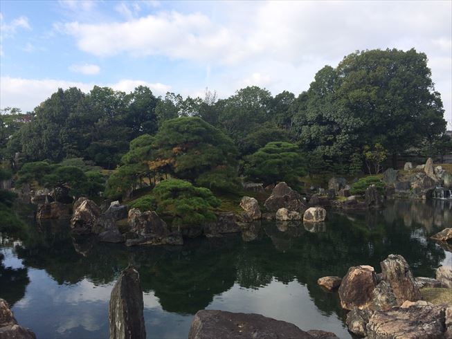 二条城二の丸庭園 (ニジョウジョウニノマルテイエン)は、池を中心とした書院造庭園となっていて、庭には、3つの島を置き、4つの橋を架けて、西北隅に滝を落としているそんな配置です。ぜひ、一度、利用してみてください。