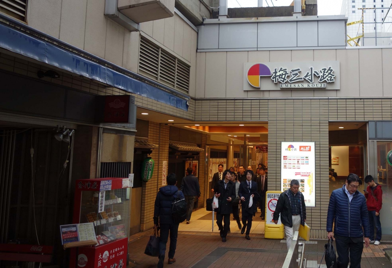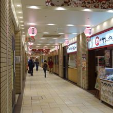 JR大阪駅をガード沿いに歩いて横断歩道を渡るとチョット小さ目なアーケードがあります。飲食店を中心とした17のショップが並んでいます。中央にスペースを取っているのはソフマップです。アーケードを出たすぐにたこ焼きで有名な会津屋があります。