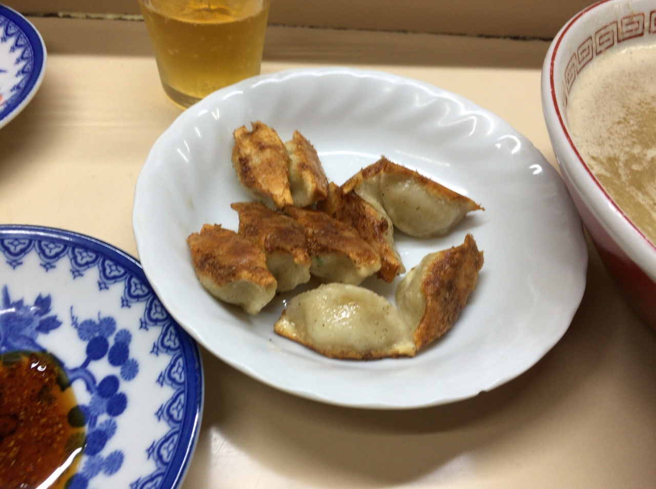 夜の9時オープンのお店です。店内はカウンターのみ。夜なのに行列ができます。15分くらい待って入店しました。こてこての豚骨ラーメンです。これぞ豚骨っていう感じです。餃子は一口サイズです。パクパク食べれます。