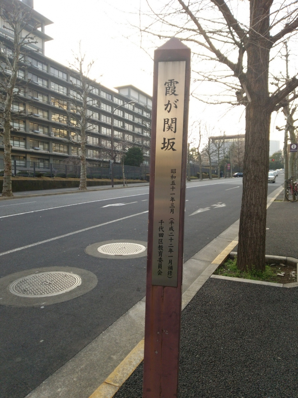 外務省と総務省の間にある坂道です。中世の頃、この辺りに関所が置かれていたことから名が起こり、江戸時代には広壮な大名屋敷が建ち並んで、錦絵にもよく描かれていたようです。霞が関の名称は、現在でも中央官庁街の代名詞として使われています。