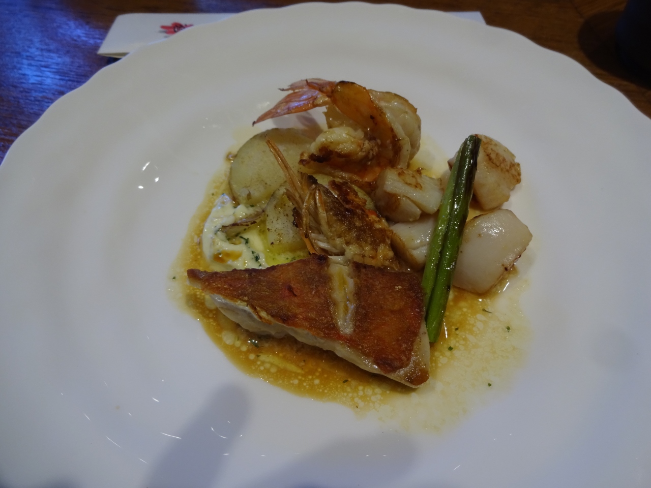 サラダ、スープ、メイン(魚介は金目鯛、ホタテ、海老)付け合わせの代わりにでしょう温野菜が別皿で。