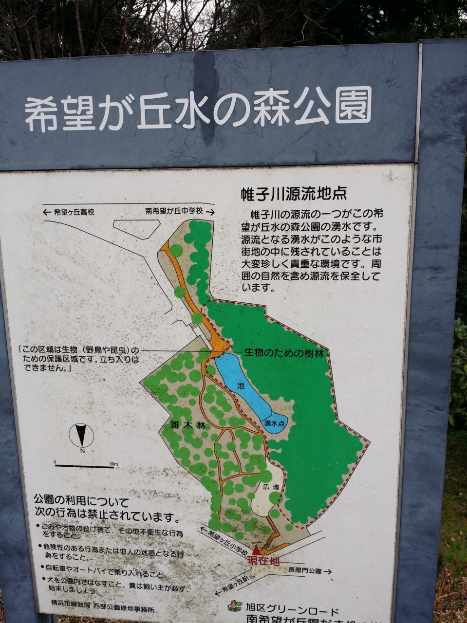 相鉄線希望ヶ丘駅から徒歩10分ほど、南口から坂をあがっていくとあります。横浜の旭区にはいくつかこういった緑豊かな公園があります。ここの公園は住宅街に囲まれていますが、帷子川の源流になっていて、水源地でもあります。横浜でもきれいな水が流れる水源を見れるのはとても見れると思います。