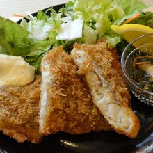 福島県相馬市復興支援センターなども入っている仮設市場の中にある飲食店です。ほぼ無休の店舗には、昼は復興作業員がランチを食べ、夕方は近所の人がお茶をし、夜は家族連れや作業員で賑わっています。ランチセットは、地元産の大きなアジフライ、サラダ、御飯、味噌汁などがついて、1000円とお得です。