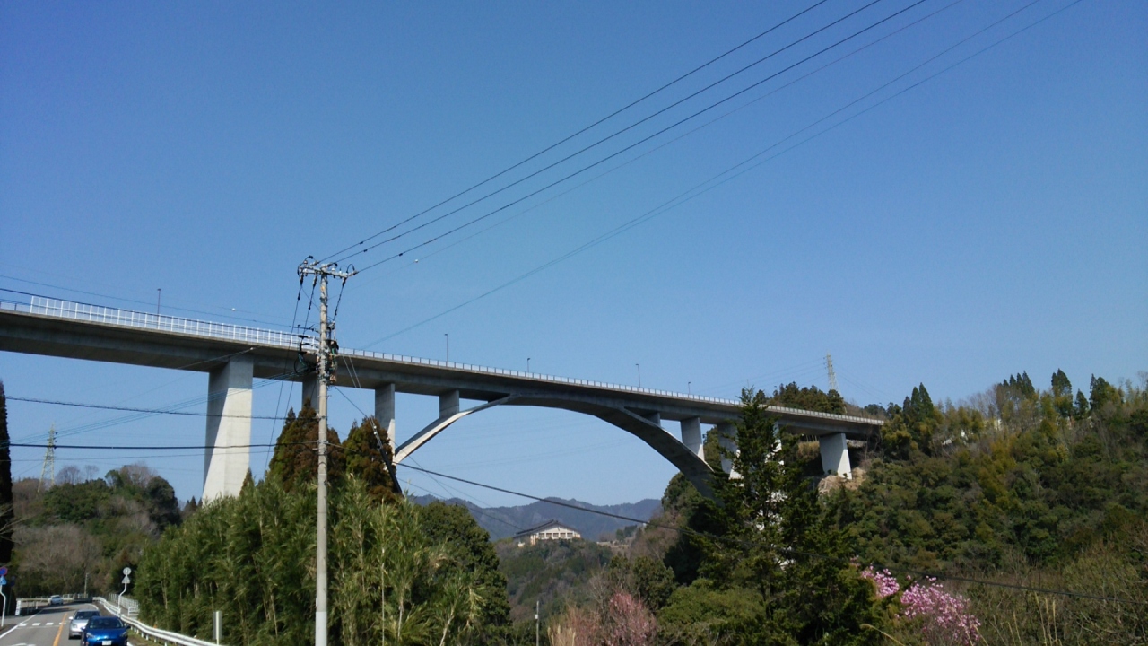 国道バイパス沿い、道の駅高千穂近くの新しい橋です。両側の歩道も広く大きな橋でよく言えばモダン、悪く言えば質素な橋に思います。大きいだけあり、下から見上げると高い位置にありますが、かなりの迫力です。技術の進歩で徐々に高く場所に長い橋を架けられるようになったということが分かります。