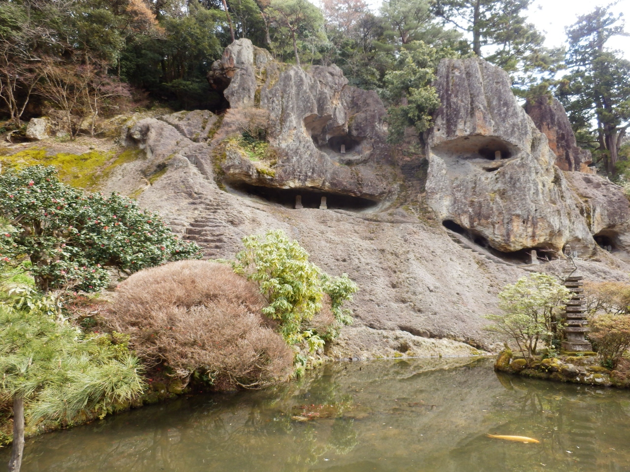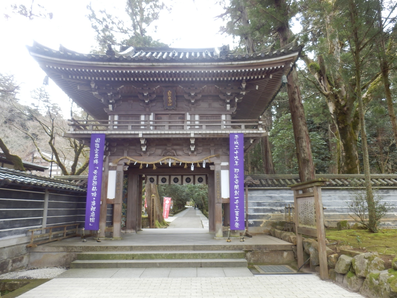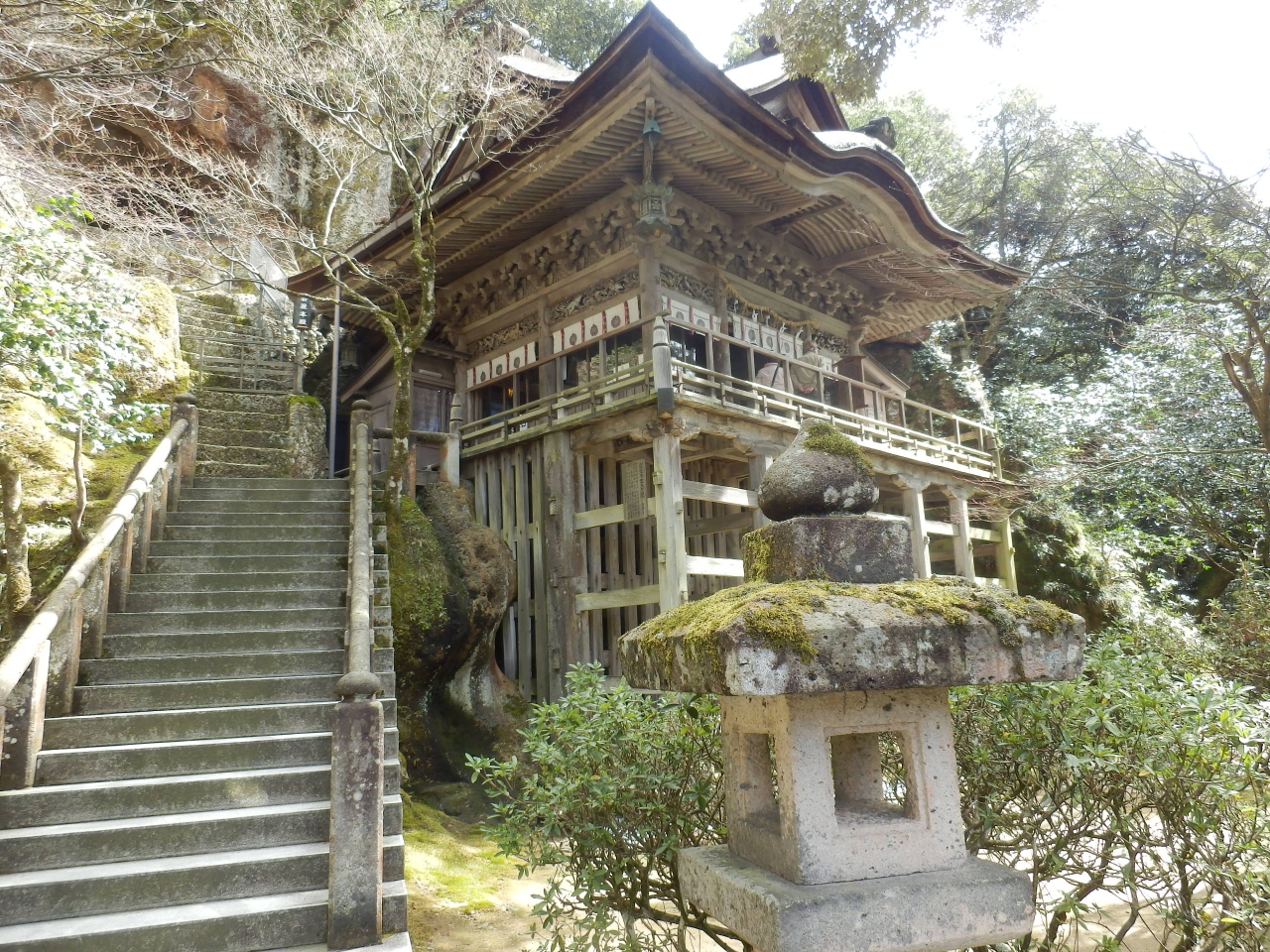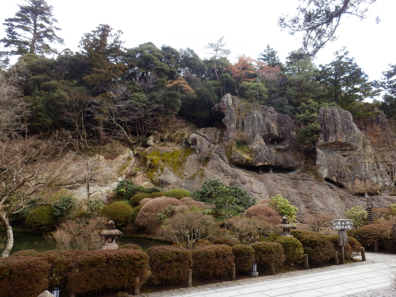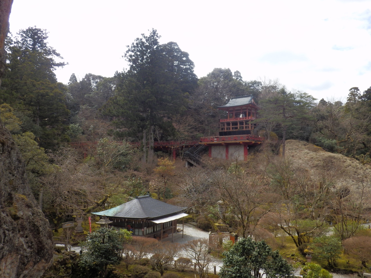 小松からレンタカーで行きました。あまり調べずに訪れたら、境内の広さに驚きました。入口近くには美しい苔の庭園がありましたし、参道を進んでいった先には崖にへばりついた美しい岩や本殿、その向かいには三重塔や真っ赤な橋、そしてお堂など。見どころがとても多くて、散策するのに予想以上の時間がかかりました。