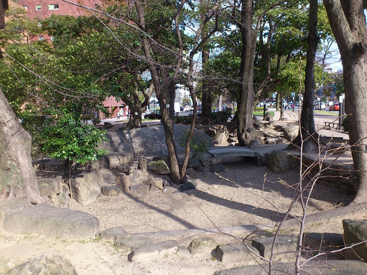 広島平和記念資料館から平和大橋を渡って広島城へ向かう途中に、白神社という神社が左手に現れます。その手前にこの池の跡があります。ANAクラウンホテルの目の前です。国泰寺とは広島藩の菩提寺のことですが、原爆で破壊されてしまったので、この水の無い池の跡が現在は残るがけです。