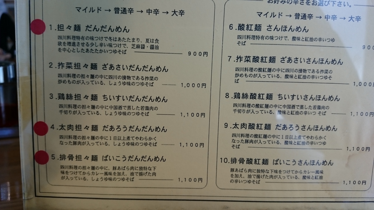 警備の警察官が立ち並ぶ日本の政治の中心という場所柄、ちょっと高いのかな?とビビりつつ入ってみました。メニュー表を見ていると「お勧めは1番から5番ですよ」という店員さんの声。1番の担々麺(だんだんめん)は900円と、意外にリーズナブルな値段で安心しました。