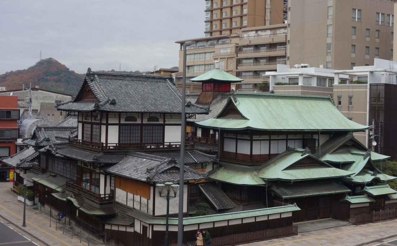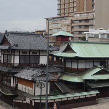 多分、道後温泉のパンフレットなどでも使われていると思います。ココは本館の全景を写真に収めるには絶好の撮影スポットになっています。名前は空の散歩道となっていますが実は冠山駐車場の建物の裏側の狭いスペースですね。