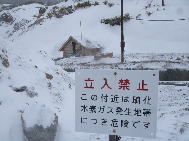 周辺には「立入禁止 この付近は硫化水素ガス発生地帯につき危険です」の看板がいくつも立っています。万座温泉最大の源泉から豊富に湧き出ていて、周辺には、硫黄の黄色い湯の花が周辺一杯にあります。柵から中へは入れません。