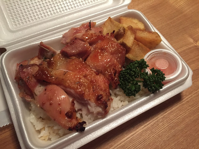 最近、日本でもブームなのか?ごはんの上にローストチキンが乗っかった「チキンオーバーライス」のお店。500円でチキンオーバーライスがいただけます。イートインも出来ますが数席のみです。今からの季節であれば、すぐ近くに大川があり、川沿いのベンチに座っていただくのも良いかと。ビールやワインも置いてあります。ソースもサルサやレモン、ガリックなど選べるようになっているので、好みのものをいただけます。野菜がいろどり用のパセリがちょこんと乗っているだけで、その辺がアメリカっぽさを感じるような気がします。お店のお姉さんも愛想が良くて、気持ちの良い接客でした。スープも付いてきます。