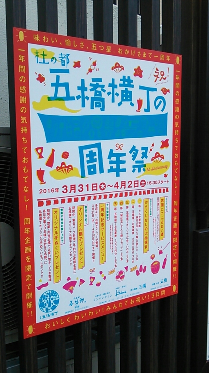 ちなみにこの「五橋横丁」、2016年3月末で開業1周年を迎えるそうで、2016年3月31日~2016年4月2日の3日間、「周年祭」という名のイベントが開催されるそうです。期間中は店頭にて日本酒又はオーガニックボルドーワインが振る舞われる他、抽選で2000円分のお食事券等が当たる抽選会の開催、1周年記念サービスメニューの提供といったものがあるそうです。