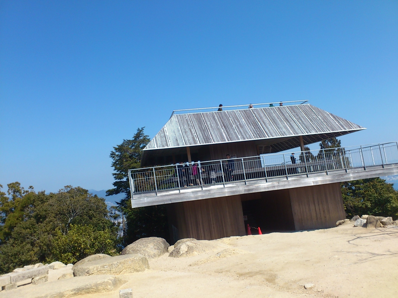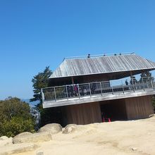 違う種類のロープウェイを乗り継いで行きます。ロープウェイを降りた後に、原生林の中を下ったり登ったり、案内図によると30分で頂上に着くと書いてありましたが、休み休みだったのでもう少し掛かりました。履物は注意した方が良いです。展望台は3階建になっていて、2階・3階が展望所兼休憩所に成っていて、お弁当を食べている方もいました。瀬戸内の島々が一望でき、絶景です。