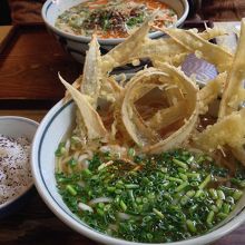 麺は、ごぼ天うどんと坦々うどんの汁ありを注文しました。