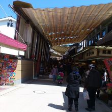 宮島フェリーを宮島桟橋で降りて、厳島神社へ海沿いの道を進んで行きます。車では入れないように柵があるので、そこを左に曲がると多くの商店が立ち並ぶ参道になります。行きはそのまま海沿いの道で厳島神社へ行き、帰りに参道を通って帰ってきました。焼き牡蠣・もみじ饅頭のお店が並んでいます。