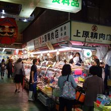 市場中央通りと肉市場通りの角にある建物が第一牧志公設市場になっています。1Fは新鮮な魚介や肉を扱うお店、2Fは最近観光客向けになった市場の食堂が並んでいます。市場中央通りの向いは公設市場雑貨部・衣料部と言う名前で市場の一部なんですね。