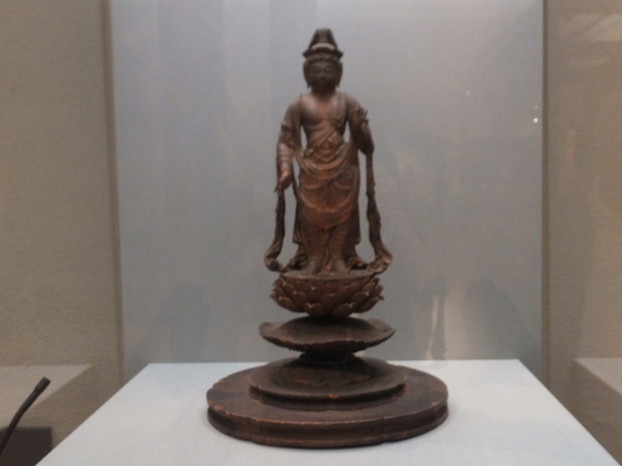 まず、2015年春に国宝になったばかりの虚空蔵菩薩立像がいきなり登場。木彫りならではの細やかな彫り。頭の先から台座まで一材で掘り出されていて、後姿もバランスよく見とれてしまいます。