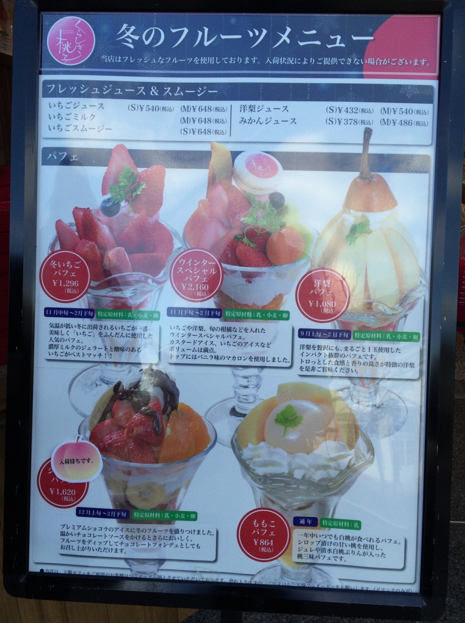 倉敷に行ったら絶対に行こうとチェックしていたお店です。美観地区にあり観光の休憩に、そしてお土産を購入しました。パフェはちょっと値段は高いですが、フレッシュなフルーツを使っていてとてもおいしかったです。ボリュームもかなりあります。