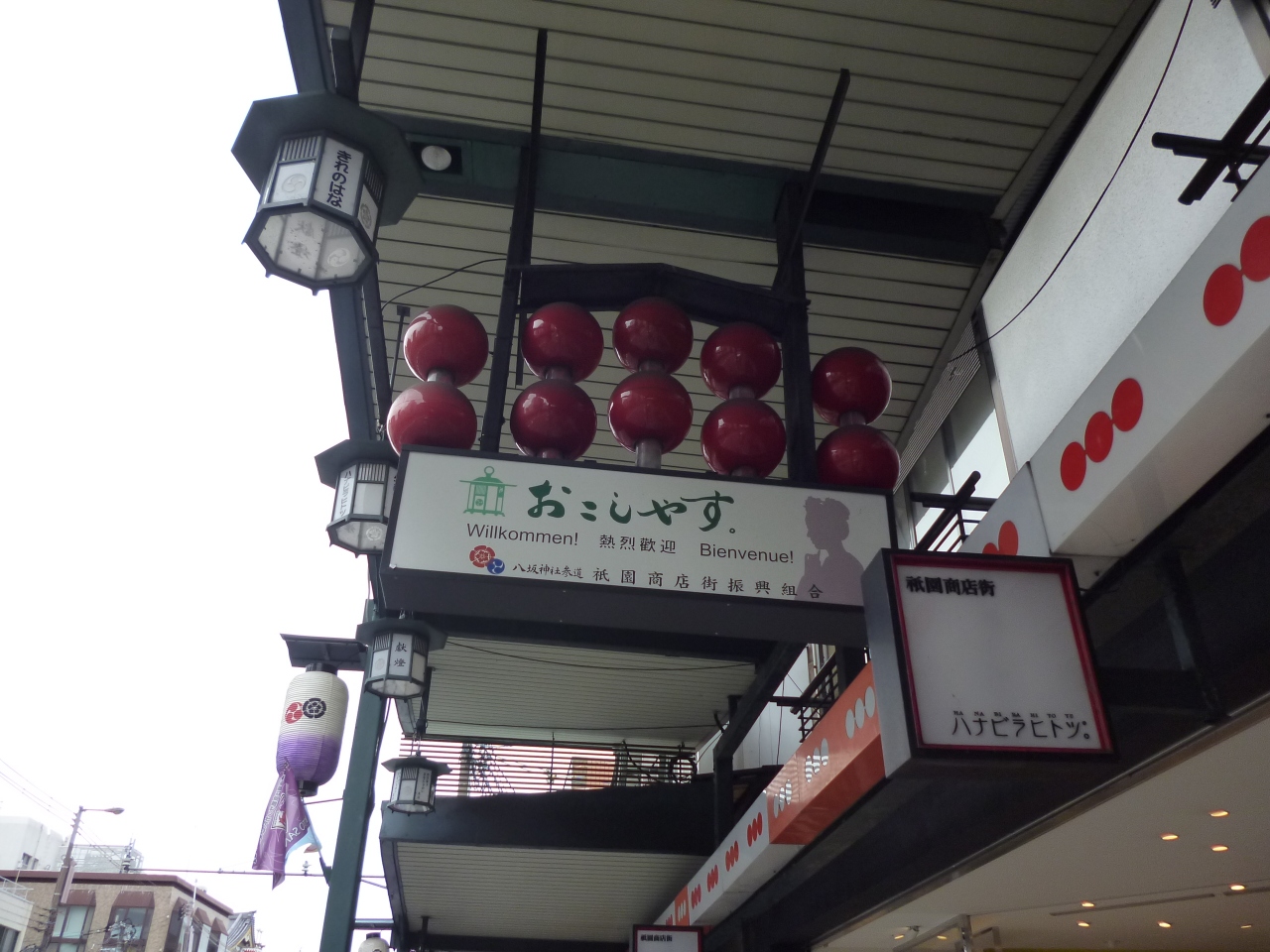 四条通の両脇に八坂神社まで、商店街があります。八坂神社門前には老舗の「いづ重」があります。よーじやカフェや京漬物大安などもあり、京都を代表するお店が集まっています。お土産を買うのも、休憩をするのにもよいところでした。