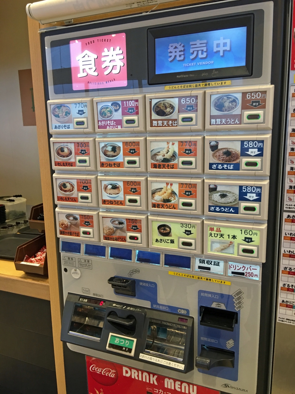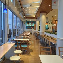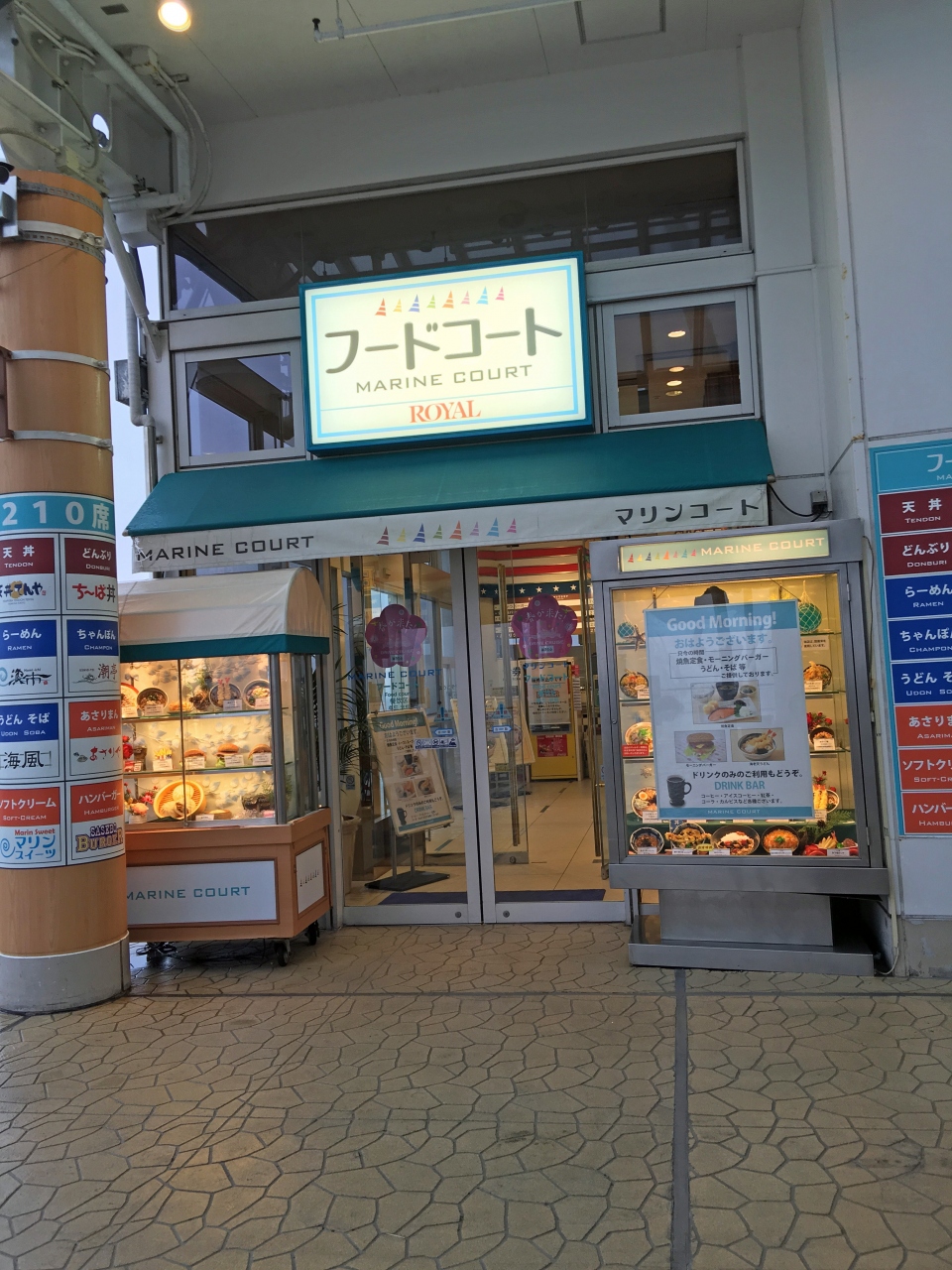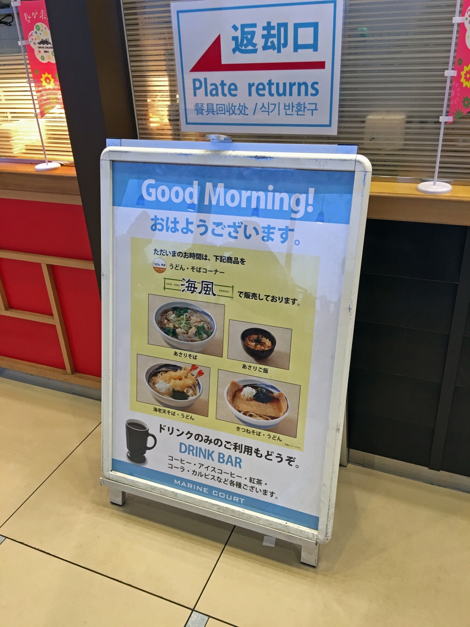 海ほたるのフードコート マリンコートには、ちーば丼、潮亭、波市、海風、マリンスイーツ、あさりや、天丼 てんや、佐世保バーガーの8店舗が出店しています。平日の朝はその一部しか営業していないようです。今回は、海風のあさりそばをいただきました。