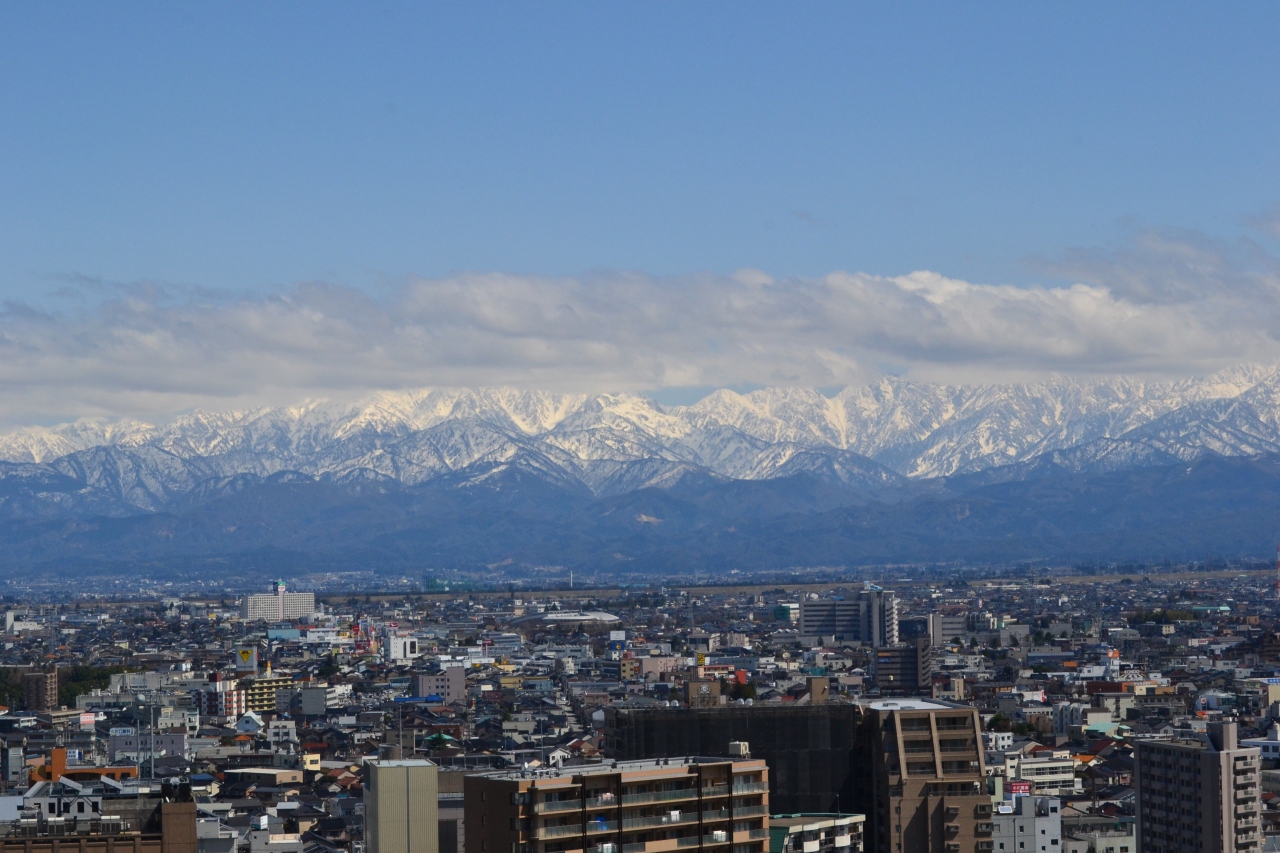 富山駅から歩くこと10分かな?南口の大通りをまっすぐ進むと右側にが農協のビルやNHK支局、県民ホールがあり、その向かい側がこの市役所である。中に入ると展望台に昇るエレベーターへの看板が出ているのでそれに従っていけばいい。誰でも無料で上がれる。目の前には雄大な立山連峰が目に飛び込んでくる。(天気がよければ)