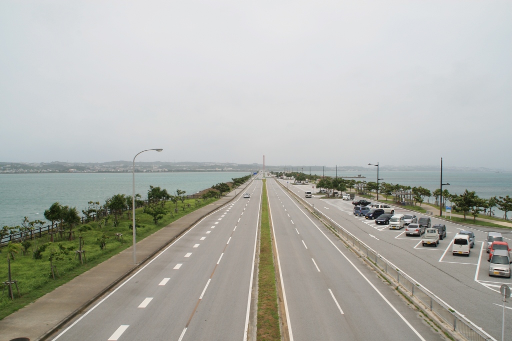 沖縄本島東部の勝連半島から海を渡って延びる道路。途中にあるパーキングエリアの歩道橋に上がると、右も海、左も海、海中道路は名の通り海の中を貫く道路であることがよく分かります。2車線道路なのでけっこう飛ばしてくる車も居るので、運転気を付けてください。