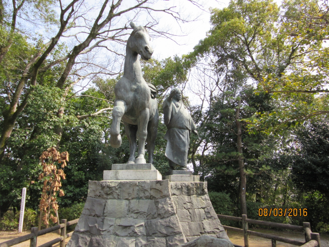 高知城に上る途中の右側に馬をひいた像が建っていました。高知城には、門の外に