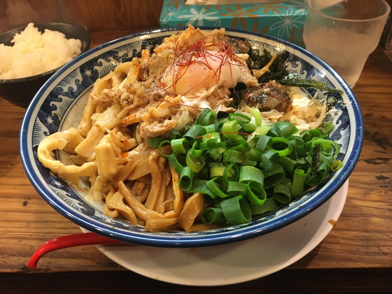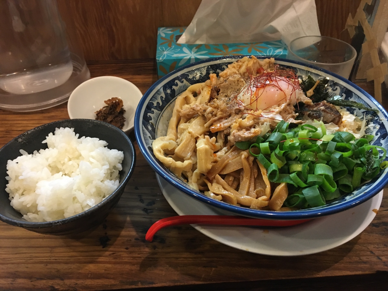 魚介まぜそば、ライス中付(950円)、大盛り(100円)。
